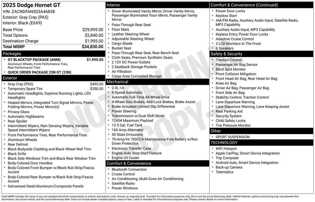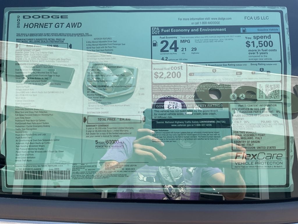 Distinctively styled and ready for action, our 2025 Dodge Hornet GT AWD in Gray Cray brings excitement to every adventure. Powered by a TurboCharged 2.0 Liter Hurricane 4 Cylinder providing 268hp to a 9 Speed Automatic transmission engineered for adventure. This All Wheel Drive SUV also caters to enthusiasts with a KONI selective damping suspension, and it scores nearly 29mpg on the highway. A prime example of dynamic Dodge styling, our Hornet has LED lighting, 17-inch alloy wheels, chrome badges, heated power-folding mirrors, a rear spoiler, and an aggressive GT grille.