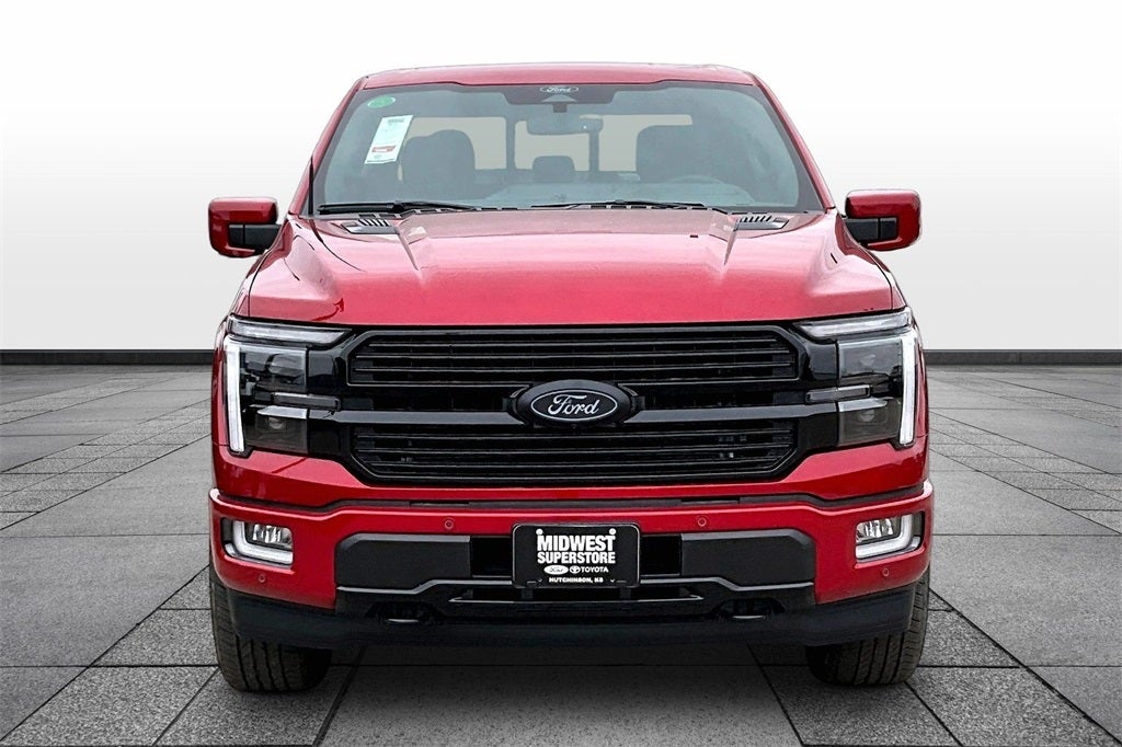 Red Metallic 2025 Ford F-150 Platinum 4WD 10-Speed Automatic 3.5L V6 EcoBoost 4WD, Adjustable pedals, Equipment Group 702A High, Heads-Up Display, Heated rear seats, Heated steering wheel, Max Tow Electronic Locking w/3.55 Axle Ratio, Memory seat, Navigation system: Connected Navigation, Pedal memory, Radio: B&O Unleashed Sound System by Bang & Olufsen, Twin Panel Moonroof, Wheels: 20 Painted Gloss Ebony Black.