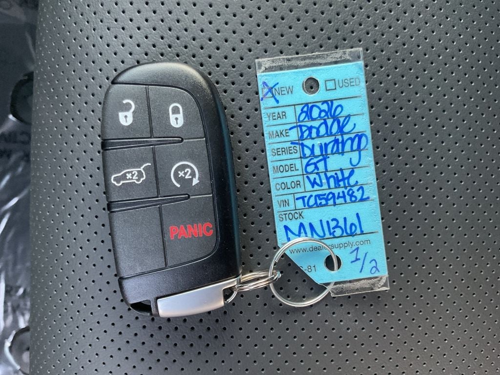 Nothing says impressive like our 2026 Dodge Durango GT Plus AWD that gets family trips off to a great start in White Knuckle! Motivated by a 3.6 Liter Pentastar V6 supplying 295hp to a paddle-shifted 8 Speed Automatic transmission with a dedicated Sport mode. A rear load-leveling suspension helps you handle life's challenges as this All Wheel Drive SUV achieves nearly 24mpg on the highway with a dominating Dodge design. Exterior highlights include a power sunroof, LED lighting, a performance hood with built-in heat extractors, 20-inch alloy wheels, roof rails/crossbars, and a power liftgate.