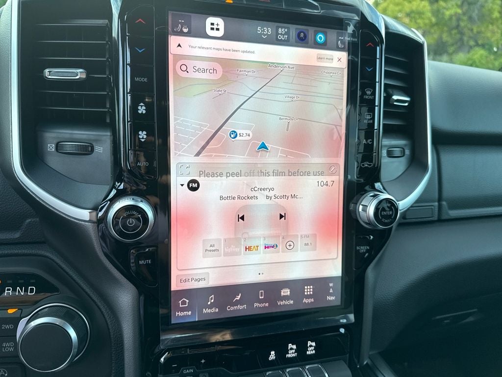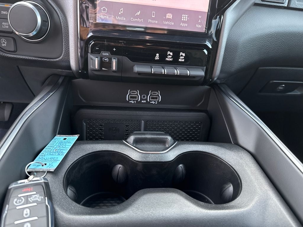 Fall in love with our Big Horn cabin, tailored to fit your needs, with the Level 2 Equipment Package's heated deluxe cloth seats, a heated leather-wrapped steering wheel, universal home remote, power adjustable pedals, power sliding rear window, dual climate control, a RAM Clean-Air System, keyless access, push-button ignition, cruise control, door-sill scuff plates, and clever cargo space, and a Uconnect 5 with 12.0-inch touchscreen features voice control, Bluetooth®, and a nine-speaker sound system for intelligent infotainment.