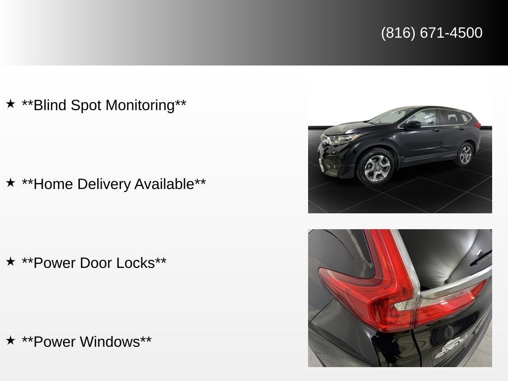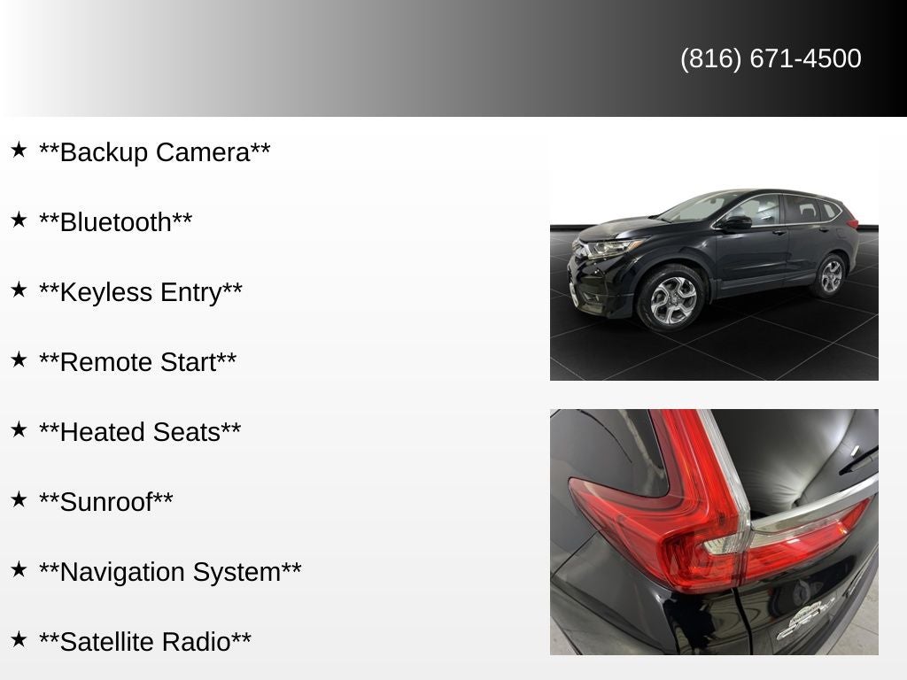 **Backup Camera**, **Bluetooth®**, **Keyless Entry**, **Remote Start**, **Heated Seats**, **Sunroof**, **Navigation System**, **Satellite Radio**, **Blind Spot Monitoring**, **Home Delivery Available**, **Power Door Locks**, **Power Windows**, CR-V EX, 4D Sport Utility, AWD, Crystal Black Pearl, Black Cloth.