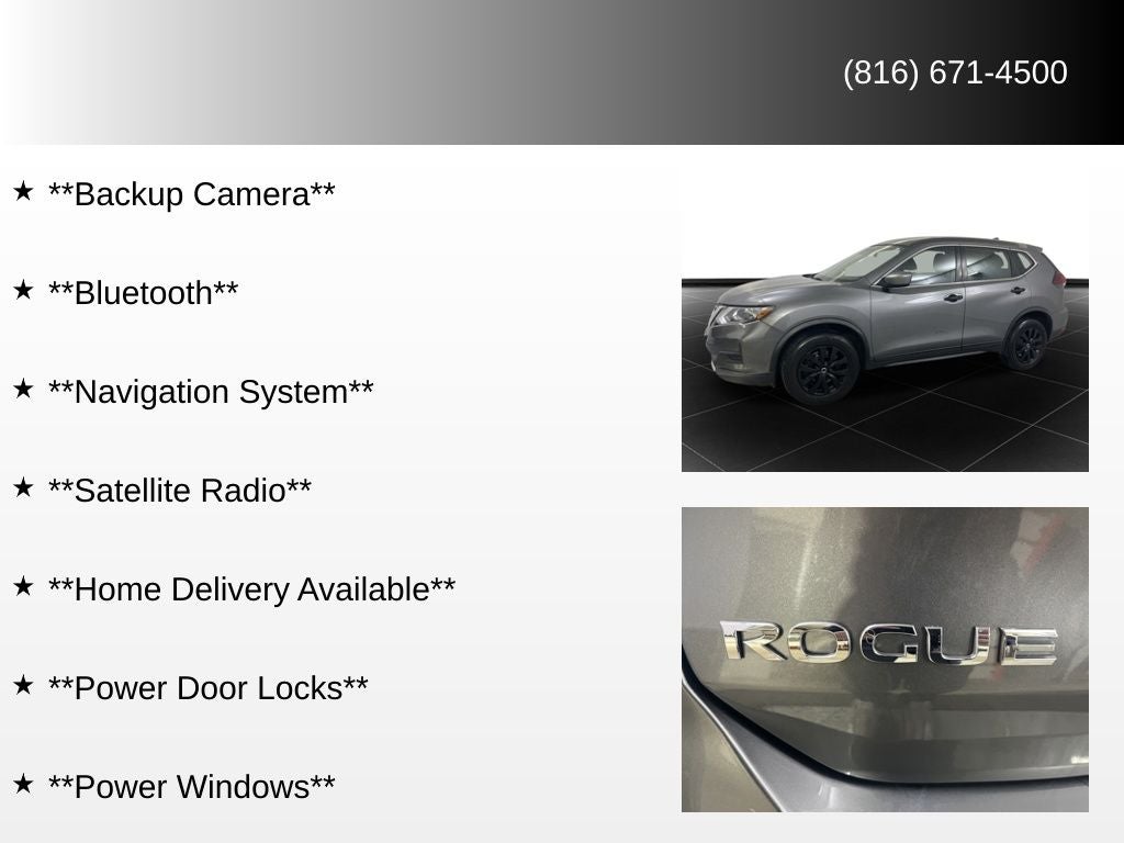 **Backup Camera**, **Bluetooth®**, **Navigation System**, **Satellite Radio**, **Home Delivery Available**, **Power Door Locks**, **Power Windows**, Rogue S, 4D Sport Utility, AWD, Gun Metallic, Charcoal Cloth.