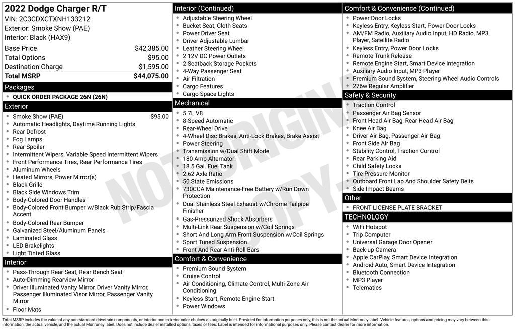 Our fantastic 2022 Dodge Charger R/T Sedan has a fierce inner spirit and a ferocious Smoke Show exterior design! Powered by a 5.7 Liter HEMI V8 offering 370hp connected to a paddle-shifted 8 Speed TorqueFlite Automatic transmission to help get the most out of that muscle. Performance suspension, exhaust, and braking systems provide further thrills, and this Rear Wheel Drive sedan can return nearly 25mpg on the highway. Our Charger's aggressive good looks get your attention with LED fog lamps, a functional hood scoop, a one-piece rear spoiler, a bold black grille, and upsized alloy wheels.